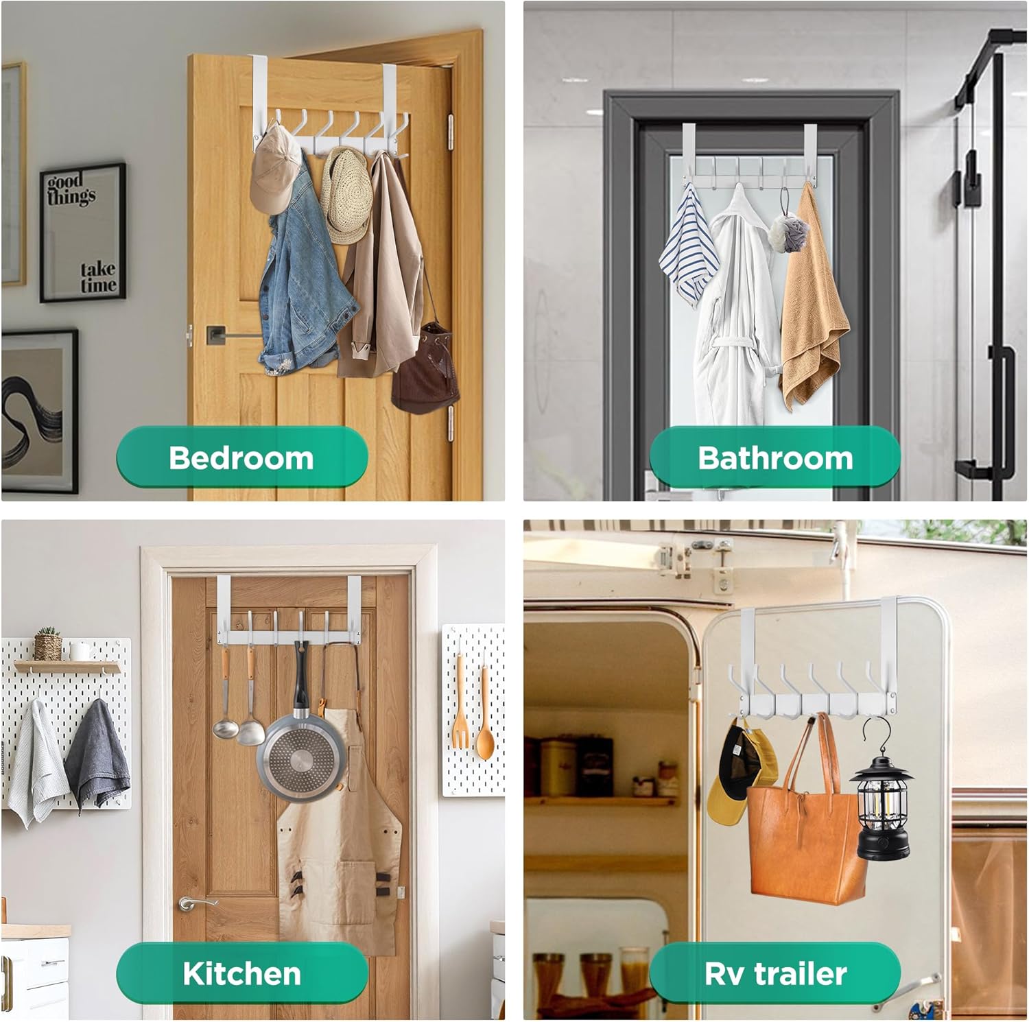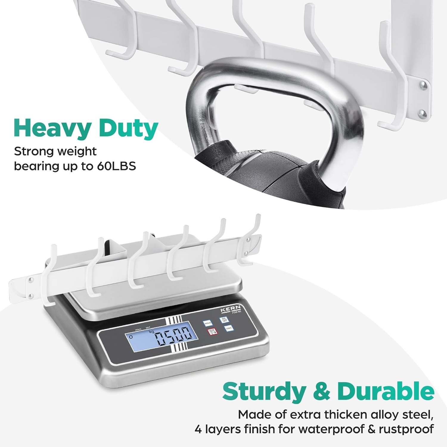 • DURABLE & HEAVY DUTY: The over door hooks is made of extra thick alloy carbon steel. Capable of supporting up to 60 pounds per hook, these durable hooks are built to last and can handle the weight of various items, from coats and bags to towels.