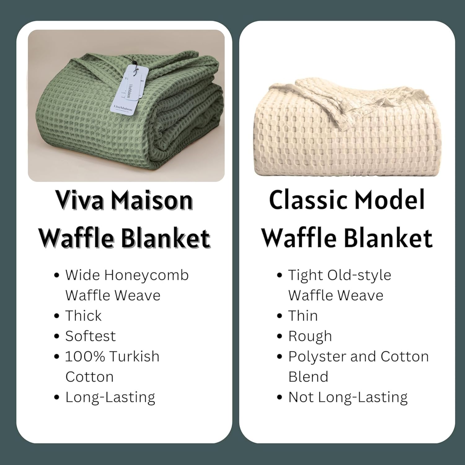 | Product Care Instructions | EASY CARE: Please wash waffle blankets separately before the first use to improve their performance. These blankets are machine washable at 40°C/104°F. Refrain from using bleach and choose low-speed drying. Viva Maison's waffle blankets are made from high-quality and long-staple 100% Turkish cotton, and they become softer after each machine wash., Machine Wash |