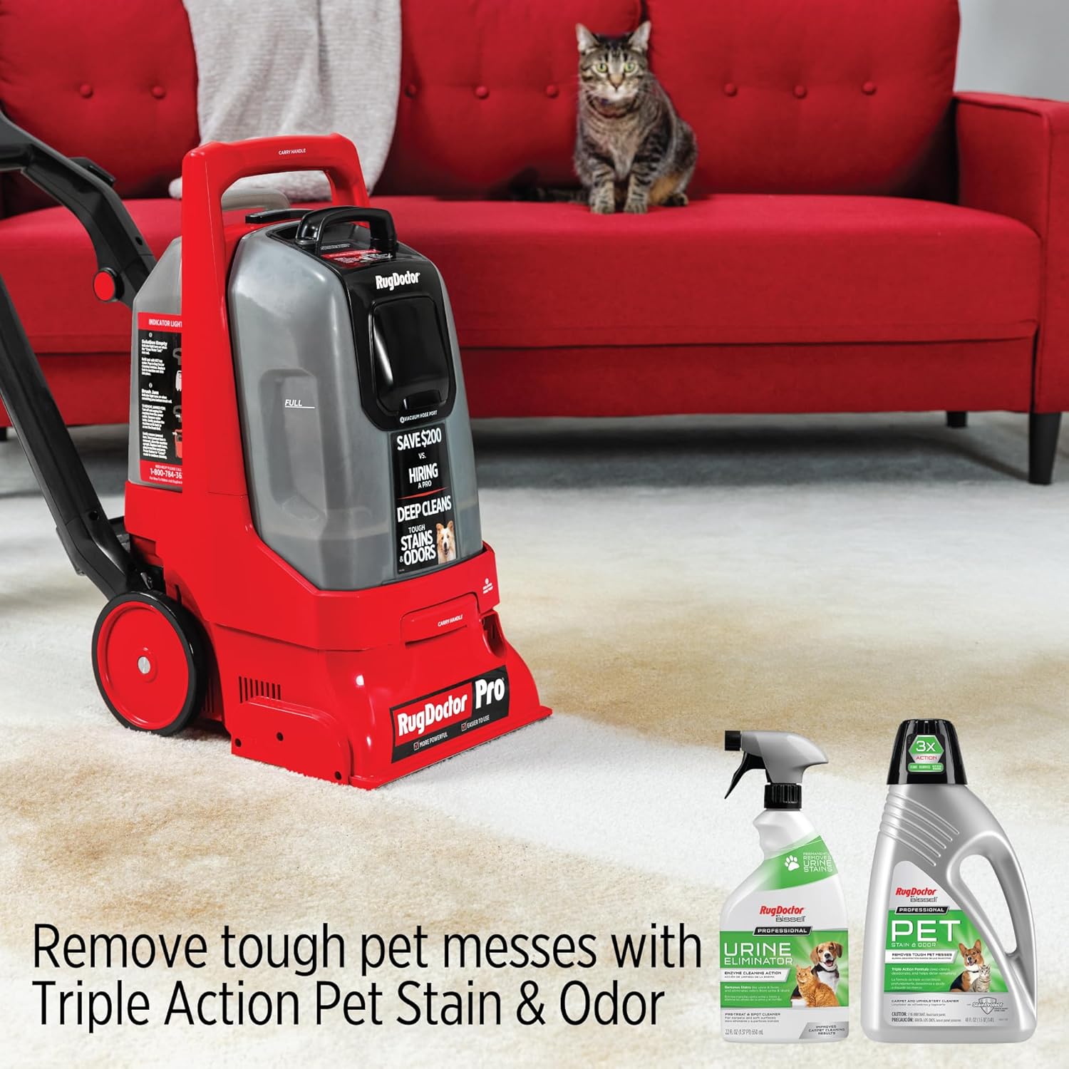 Clean with the power of the pros with the Rug Doctor Pro Deep Commercial Carpet Cleaner – Rug Doctor's most powerful commercial-grade carpet cleaning machine. Perfect for home or commercial use for apartment complexes, office buildings, schools, retirement homes and more. The Pro-Deep professional carpet cleaner machine combines pro-grade power with a user-friendly design powerfully removes embedded dirt, stains, & odors from your carpet. Engineered with intuitive back and forth cleaning like a vacuum, an ergonomic adjustable handle, and commercial-grade components for longevity and durability. Features two large-capacity tanks and built-in cleaning solution measuring cup. Digital indicator lights alert the user when cleaning solution is empty or if there is a brush roll jam. Includes two full size cleaning solutions: a 48-ounce bottle of Professional Pet Carpet Cleaner Solution and 22-ounce Urine Eliminator Spray. Backed by a 1-year limited consumer and commercial warranty. An attachable motorized upholstery tool (sold separately) can add versatility to your cleaning. Clean most area rugs, stairs, upholstery, pet areas, car interiors and more with just one machine.